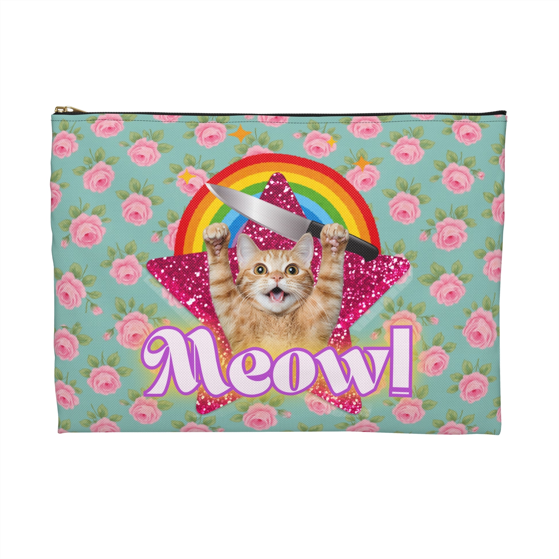 This adorable English Roses pouch features a psycho kitty and rainbow design, giving off a fun and quirky vibe. Perfect for those who love unique and playful accessories. Ideal for cat lovers or anyone who enjoys colorful and whimsical designs. Great for gift-giving during birthdays or as a special treat for yourself.
