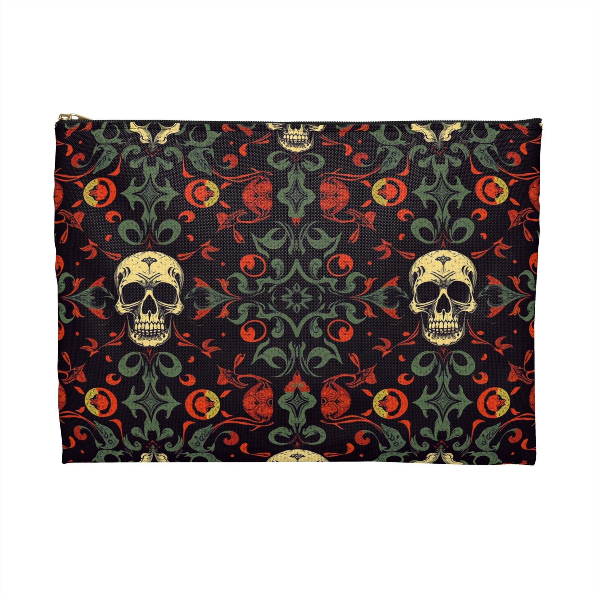 Carry a touch of gothic elegance wherever you go with this striking zipper pouch. Featuring a bold skull and floral damask-inspired pattern in shades of deep black, eerie green, and fiery red-orange, this pouch blends spooky charm with classic baroque vibes. Perfect for makeup, art supplies, tarot cards, travel essentials, or everyday items you want to keep stylishly tucked away.