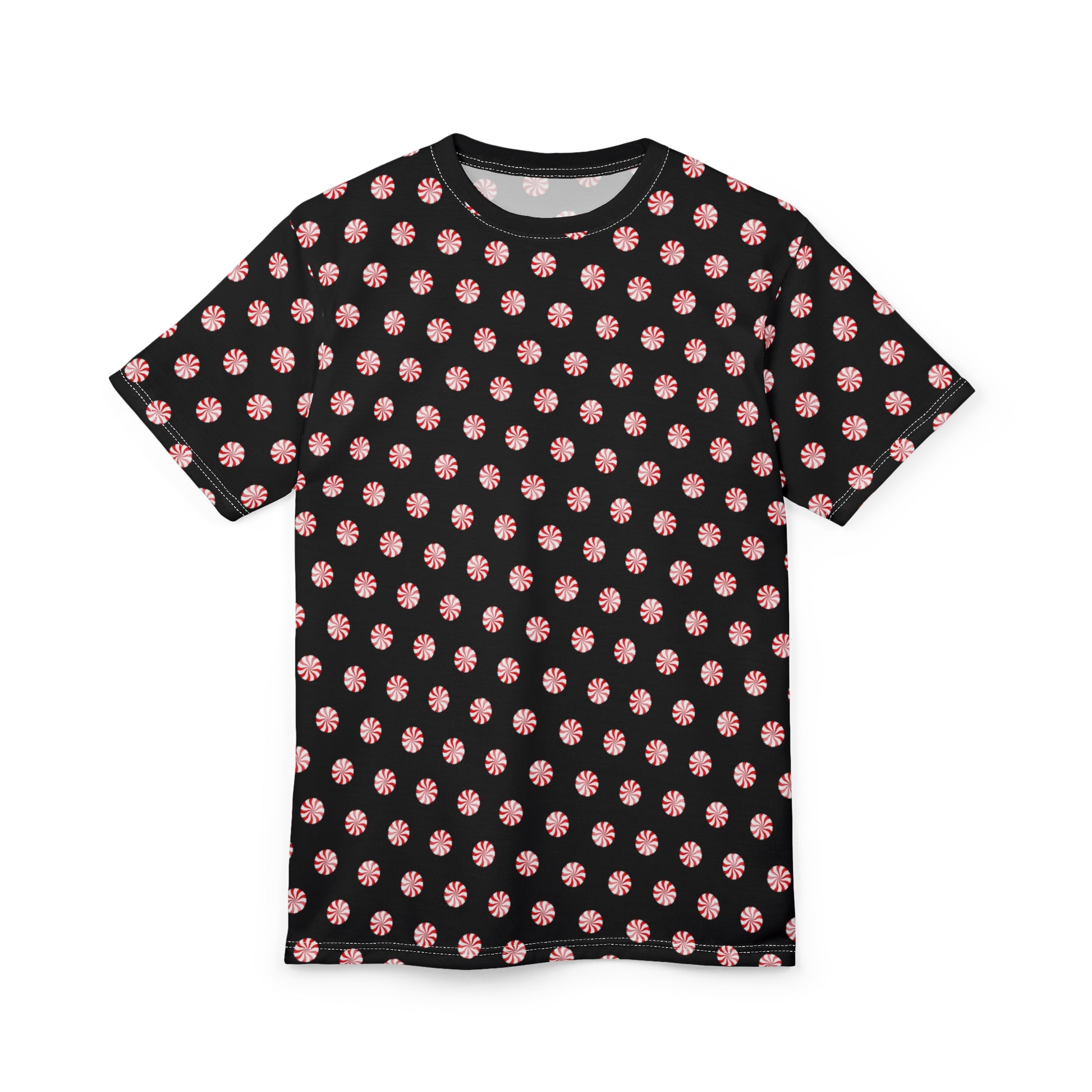 This peppermint candy polka dot tee on black gives a fun and festive vibe, perfect for those who love playful designs. It is great for casual everyday wear and can be worn during Christmas and holiday gatherings. The unisex cut makes it suitable for both men and women.