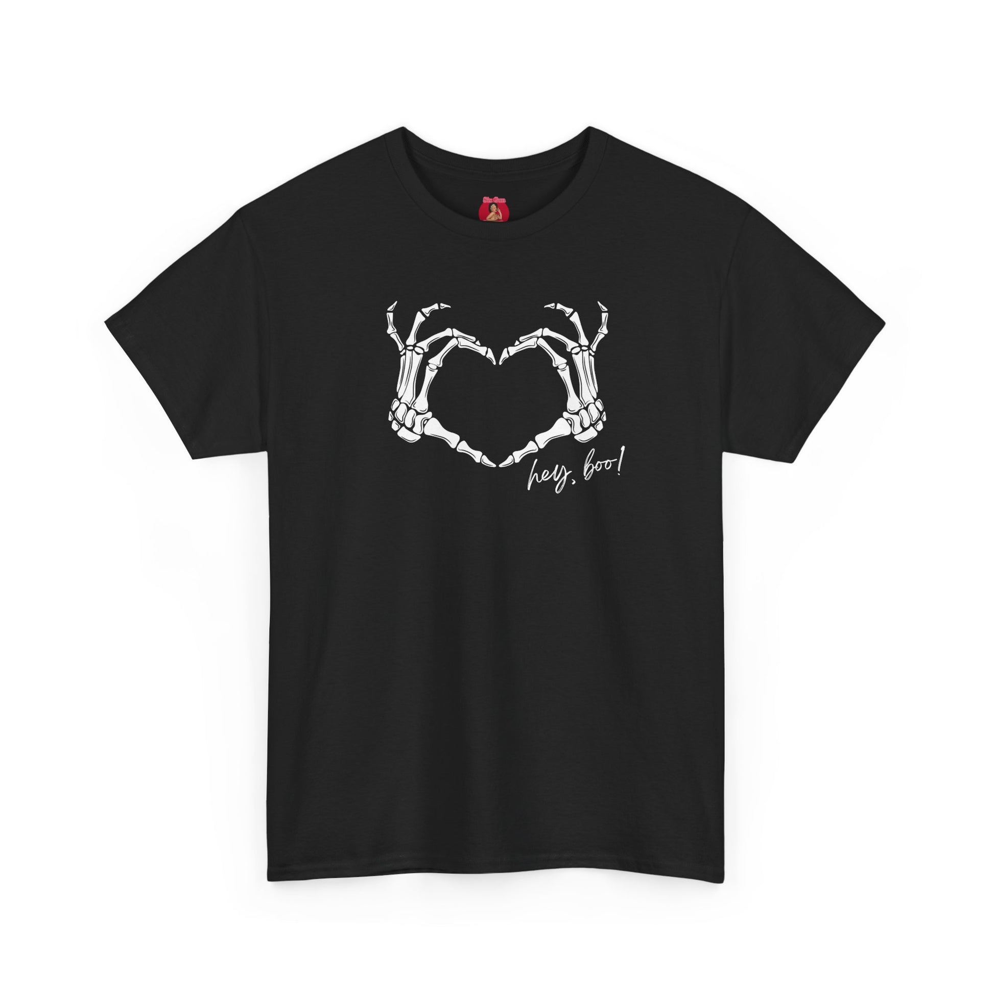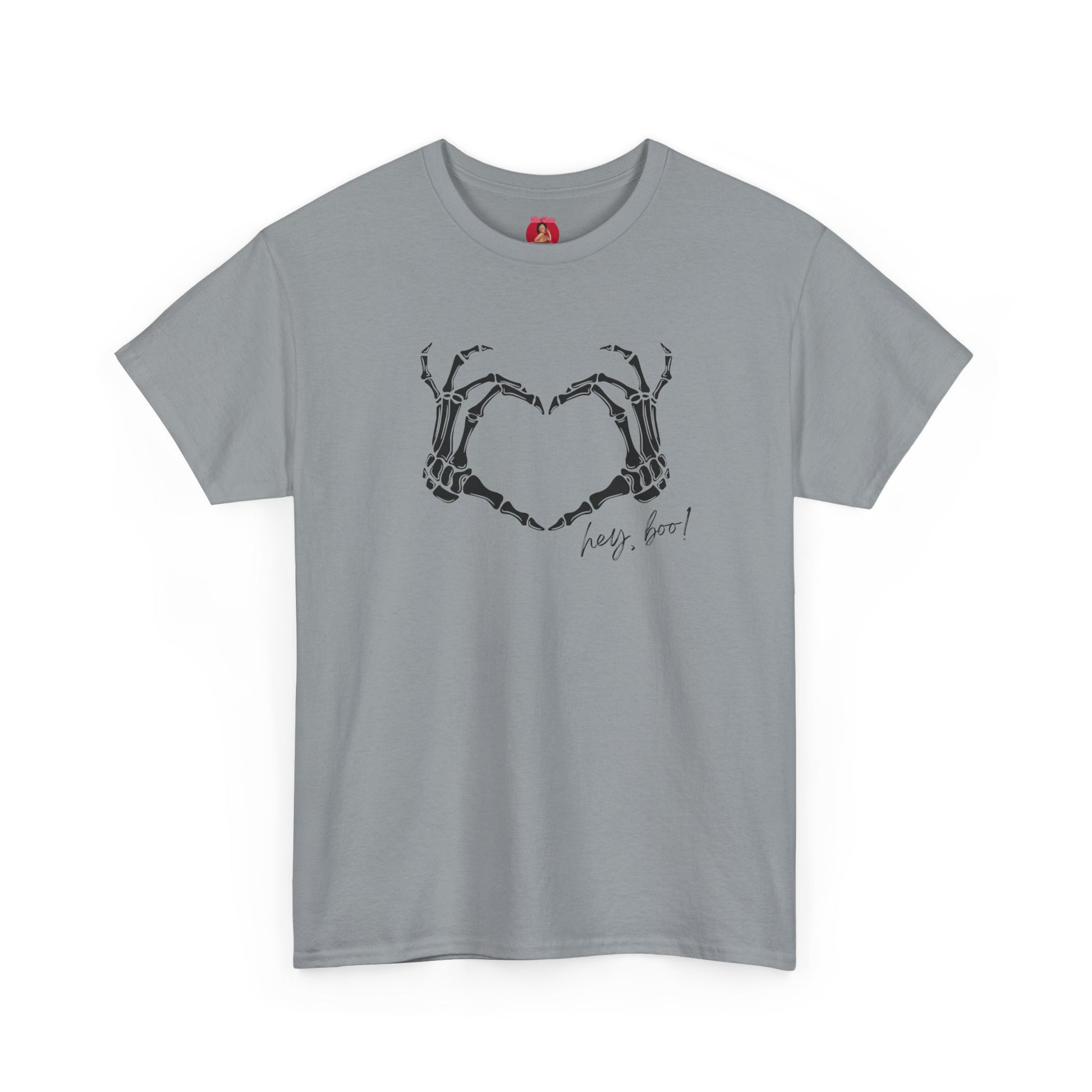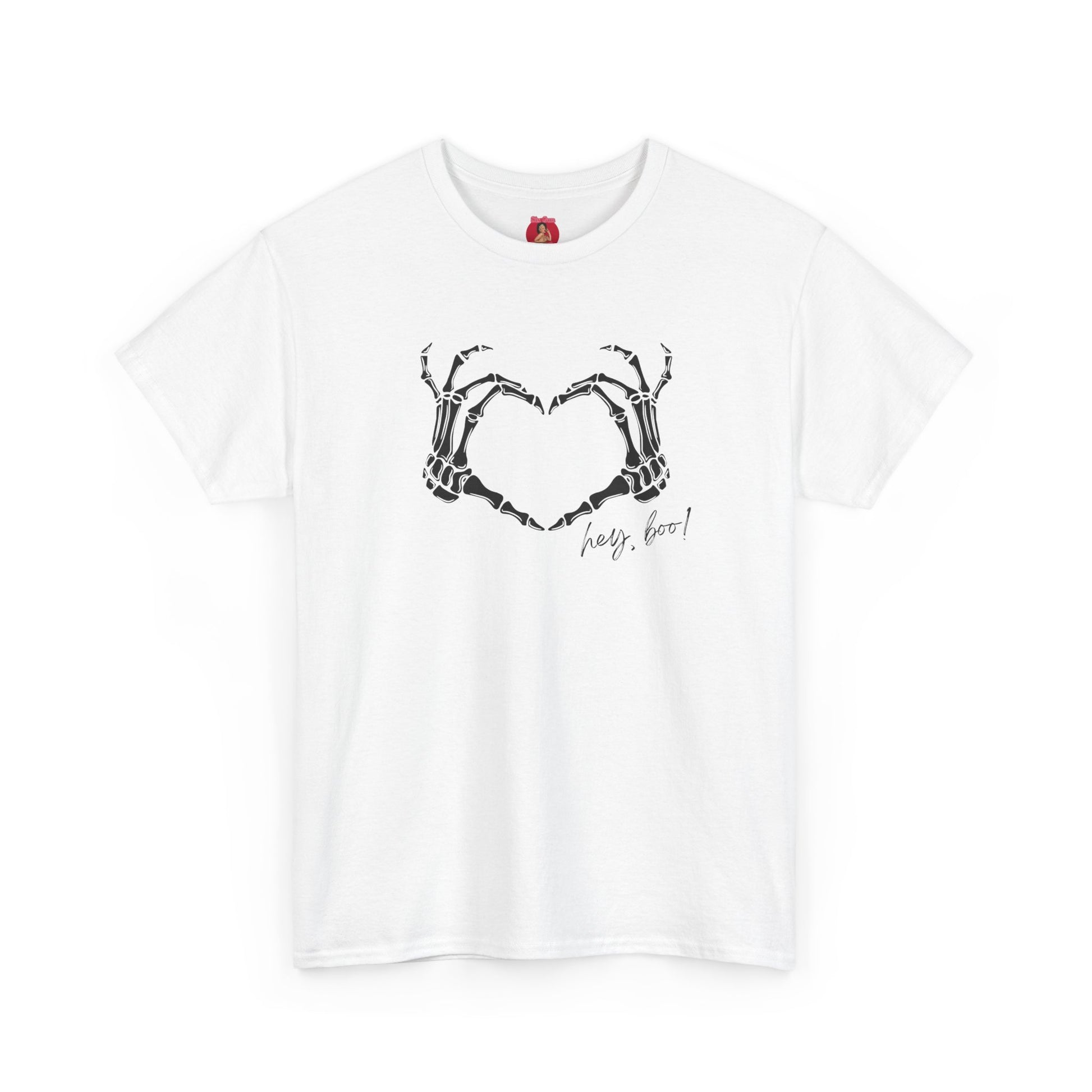 A stylish Tee featuring a design of skeleton heart hands with the text 'hey boo'. Perfect for those looking for a cool, casual vibe. This Tee is ideal for adults who want to express their edgy style during Halloween, Valentine's Day, or any casual occasion.